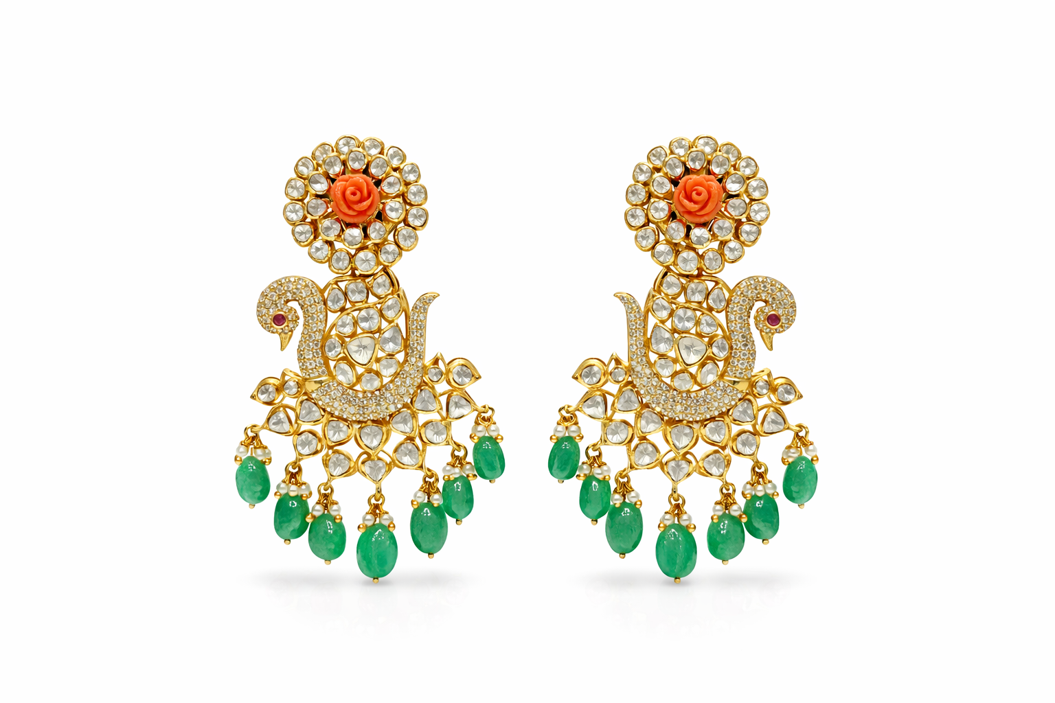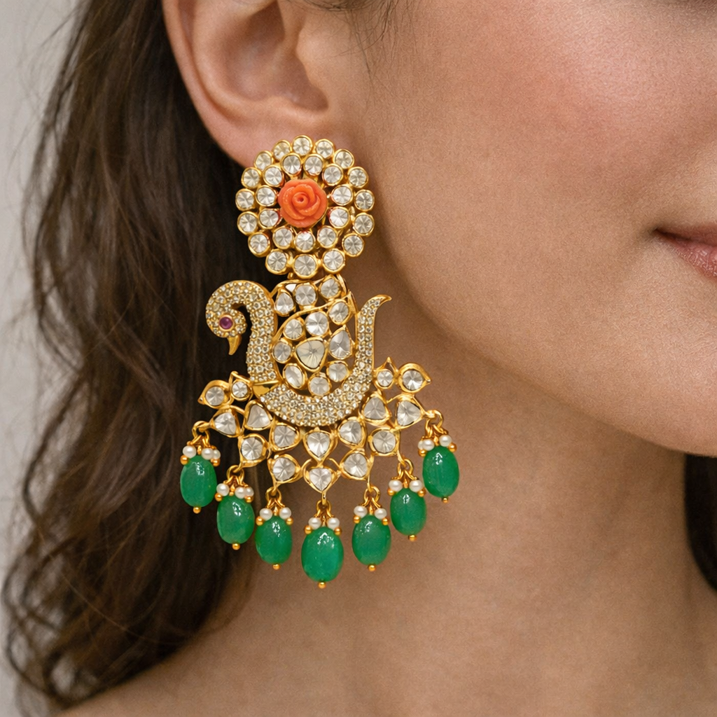 Make a statement with the Mayur Polki Earrings, a striking fusion of traditional artistry and contemporary elegance. These handcrafted earrings feature a floral coral-inspired top, intricate peacock motifs encrusted with moissanite polki stones, and graceful drops of rich green beads that sway beautifully with every movement. Finished with real gold plating over sterling silver, they offer a luxurious look without compromise. Perfect for weddings, festive occasions, and evening wear, these earrings are designed to stand out.