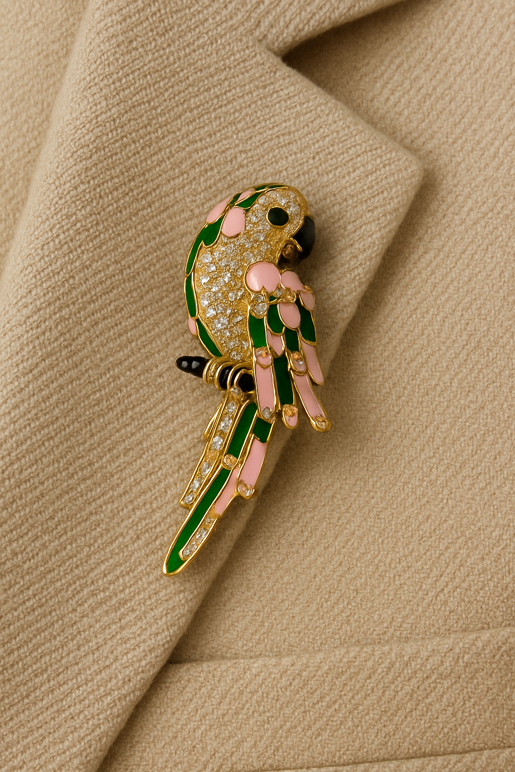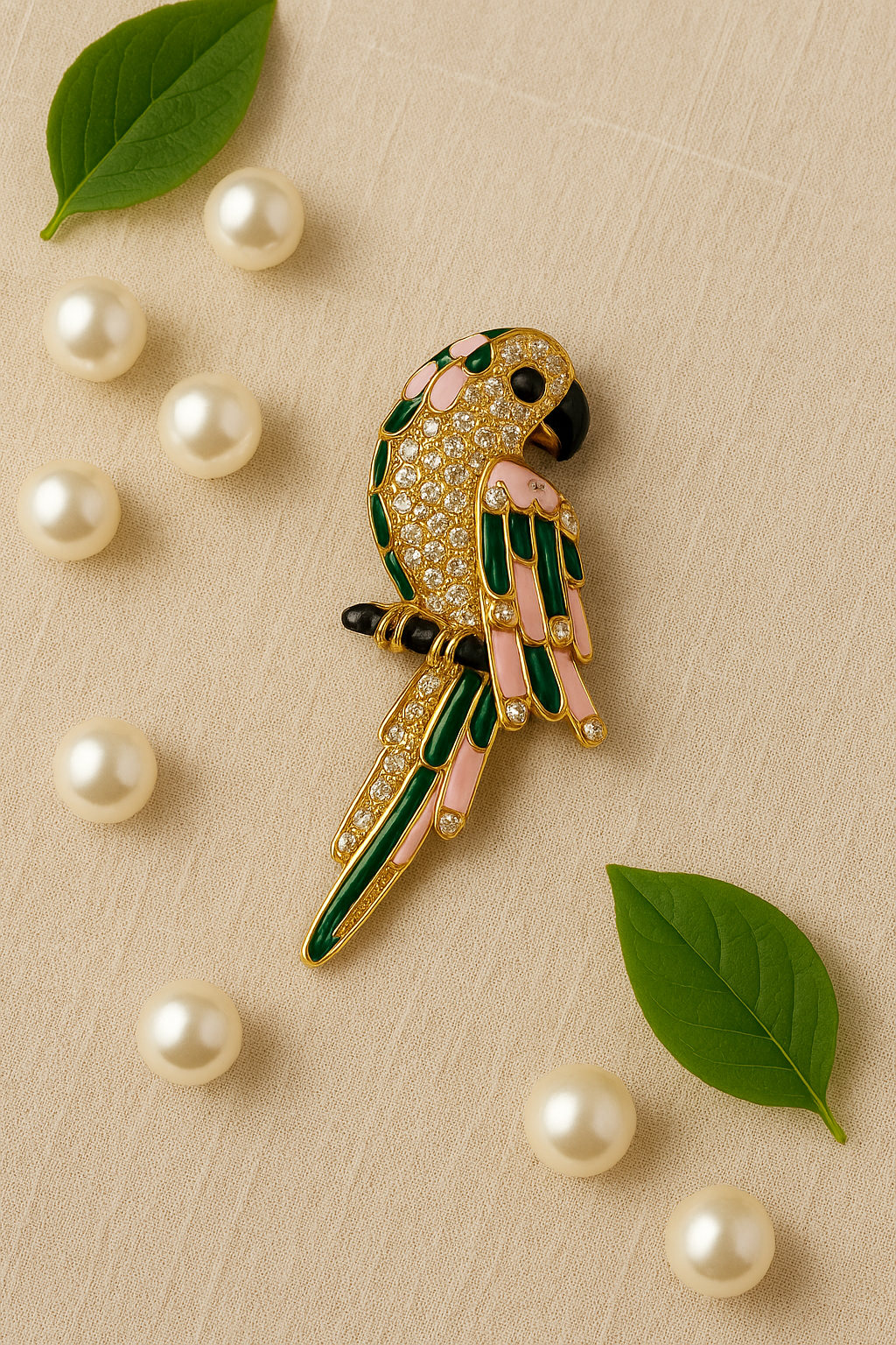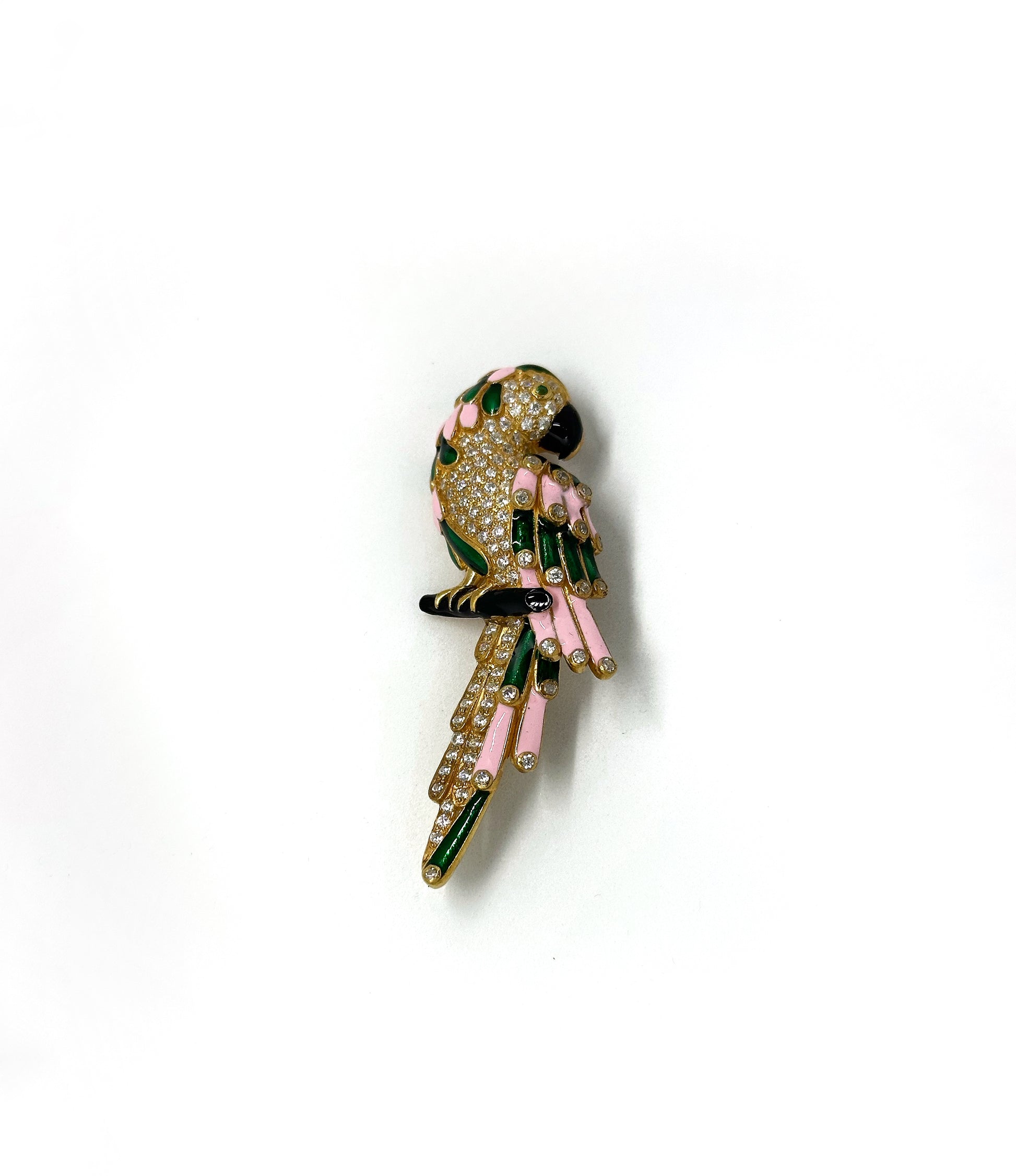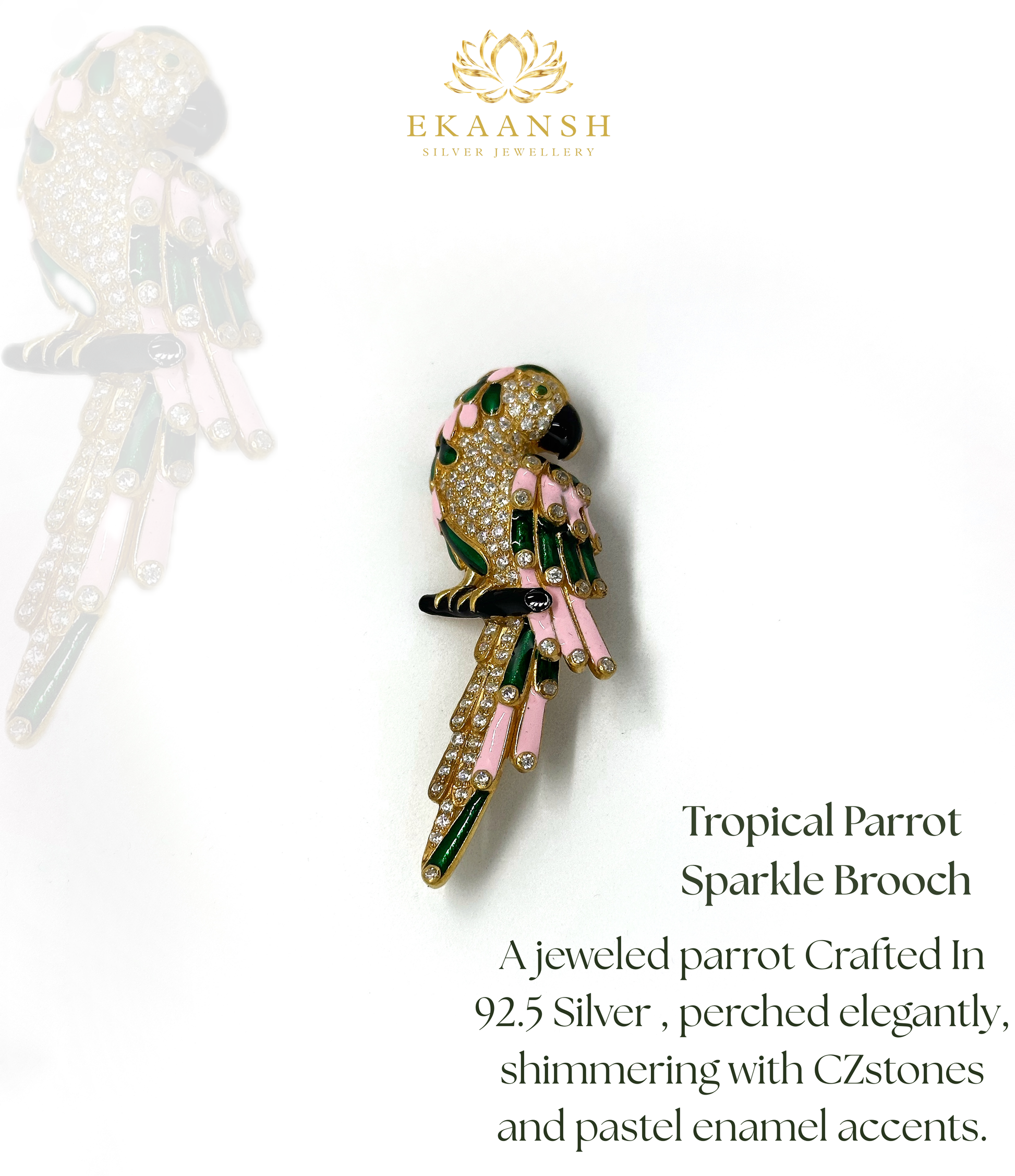 A jeweled Parrot crafted in 92.5 Silver , Perched elegantly , shimmering with CZstones and pastel enamel accents .